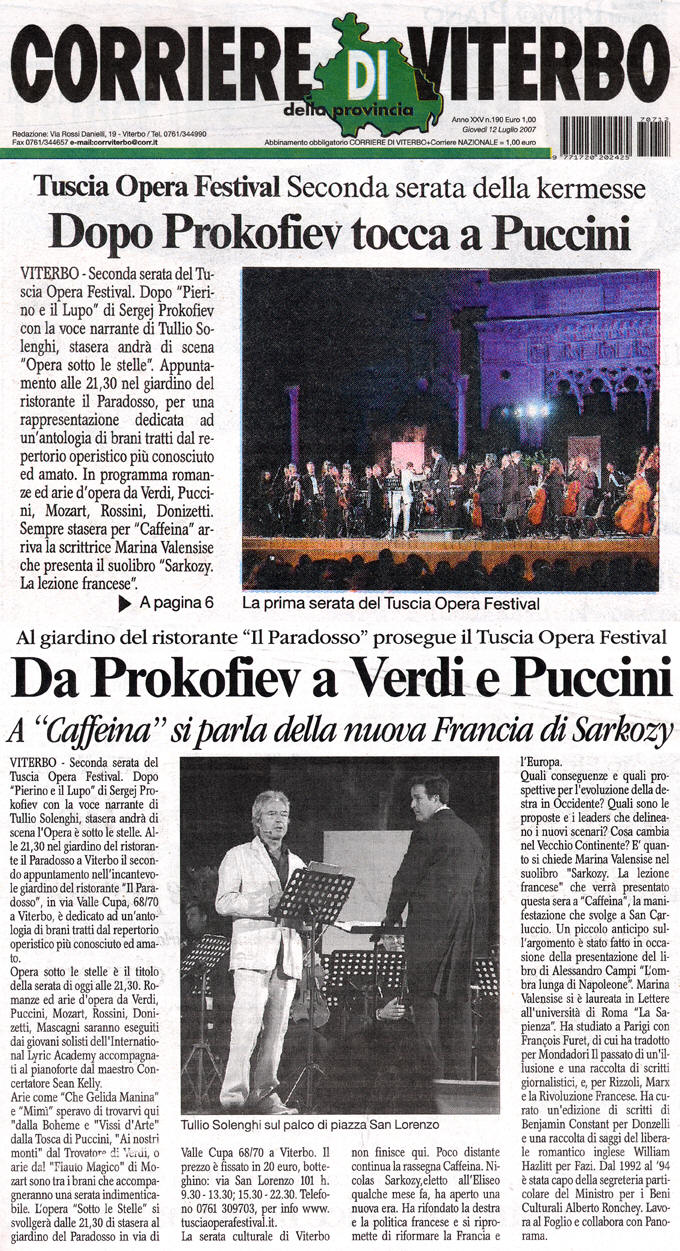 Sergej Prokofiev - Pierino & il Lupo - TULLIO SOLENGHI, Voce narrante Orchestra Sinfonica del Tuscia Operafestival - STEFANO VIGNATI, Direttore Serata di solidarietà a favore dell' A.G.O.P. Associazione Genitori Oncologia Pediatrica RASSEGNA STAMPA - CORRIERE DI VITERBO - 12 LUGLIO 2007 |