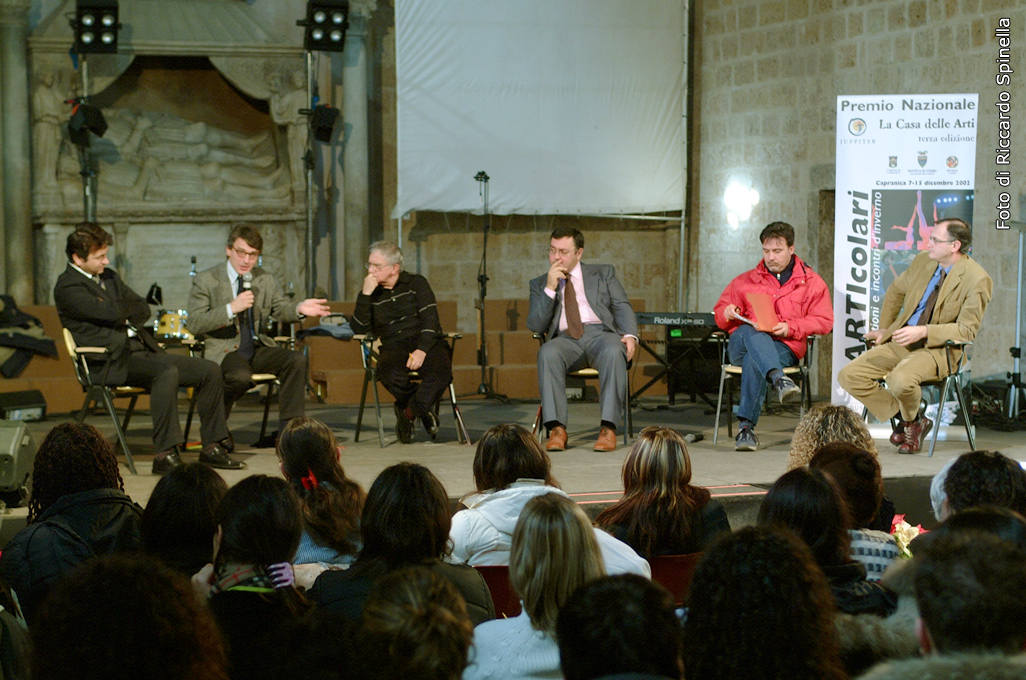 Incontri pARTIcolari Premio Nazionale "La casa delle Arti" comunicato stampa Convegno - La cultura dell'informazione: servizio o spettacolo? DSCF2114_Stessa foto in BN Con Giovanni ANVERSA (giorn. RAI), Davide SASSOLI (giorn. RAI), don Antonio MAZZI (pres. Fond. Exodus) (Capranica - piazza S.Francesco - Tempio Romanico di S.Francesco - sabato 14 dicembre ore 10.30 - 2002) |